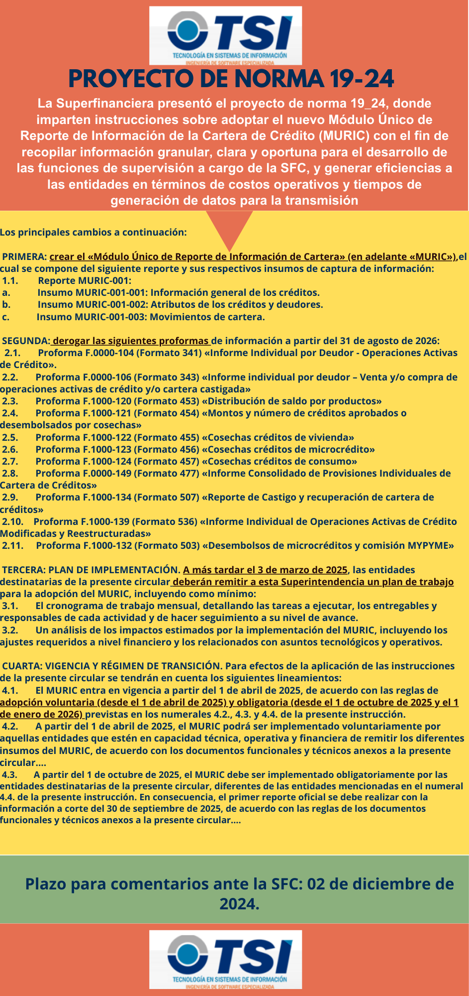 La Superfinanciera presentó el proyecto de norma 19_24, donde imparten instrucciones sobre adoptar el nuevo Módulo Único de Reporte de Información de la Cartera de Crédito (MURIC) con el fin de recopilar información granular, clara y oportuna para el desarrollo de las funciones de supervisión a cargo de la SFC, y generar eficiencias a las entidades en términos de costos operativos y tiempos de generación de datos para la transmisión.