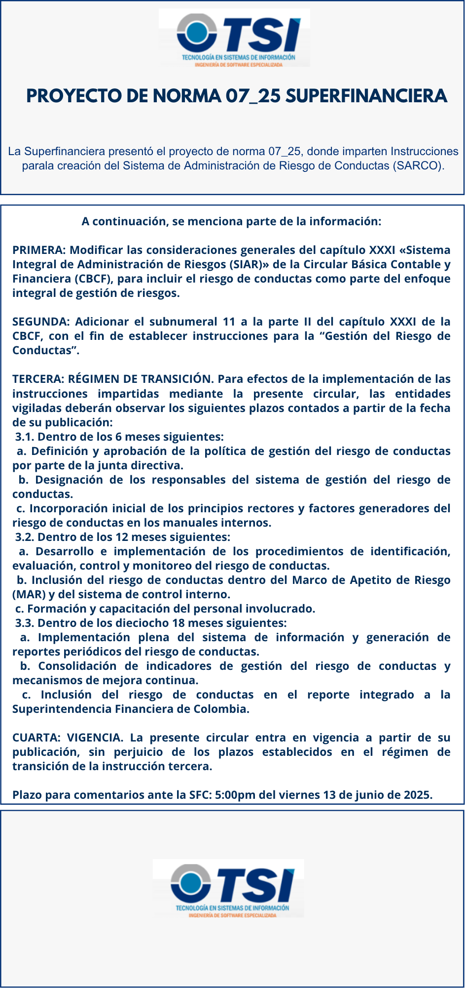 La Superfinanciera presentó el proyecto de norma 07_25, donde imparten Instrucciones parala creación del Sistema de Administración de Riesgo de Conductas (SARCO).